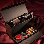 В голямата черна кутия има голямо туптящо червено сърце, 15 бонбона и бутилка шампанско.